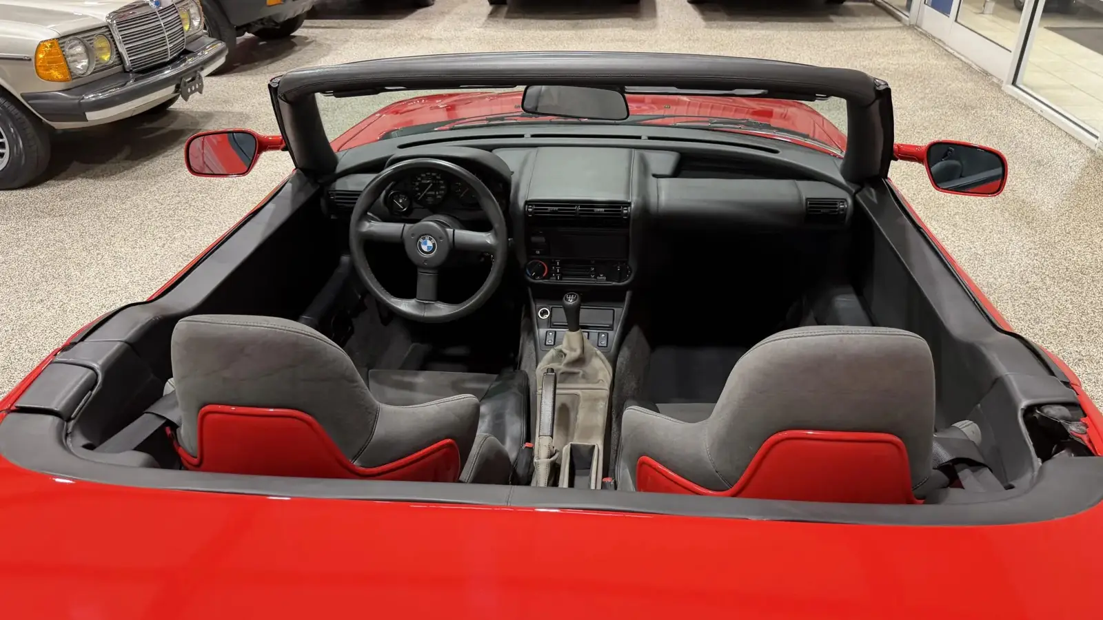 This particular example is finished in Top Red with a Dark Gray Nubuck interior and powered by a 2.5-liter M20B25 inline-six producing 168 horsepower, paired with a five-speed manual transmission driving the rear wheels. Equipment includes anti-lock brakes, 16-inch Style 11 wheels, a black soft top, and power windows. According to the auction listing, the car carries a clean Carfax report and is titled as a classic vehicle in Oklahoma.