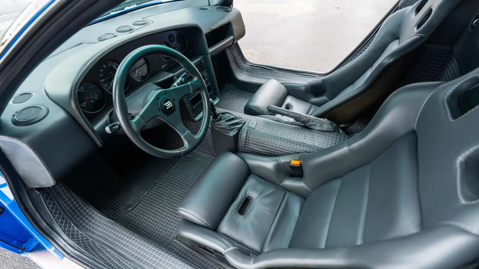 This particular EB110 Super Sport shows just 674 kilometers on the odometer. It retains its original Blu Bugatti exterior and Grigio Scuro leather interior, along with its documentation and tools. In recent years, the car has already appeared at major events, earning Best in Class honors at The Quail in 2022 and the Amelia Island Concours d’Elegance in 2023.
