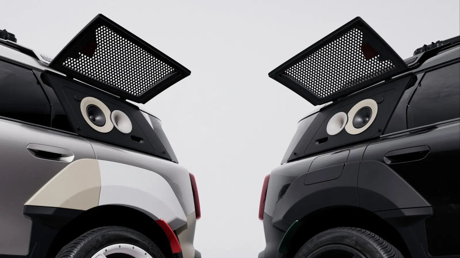 The defining feature is a sound system integrated into the vehicle structure. The rear side windows have been removed and replaced with specially developed modules designed for outdoor audio projection. At the core are speaker housings made from polymer granite, a material known for reducing vibration and supporting precise sound reproduction. Tweeters and mid-range speakers are embedded into the bodywork, while additional subwoofers are located at the rear and become active when the tailgate is opened. Each car operates as an independent system, but together they create a unified sound stage.