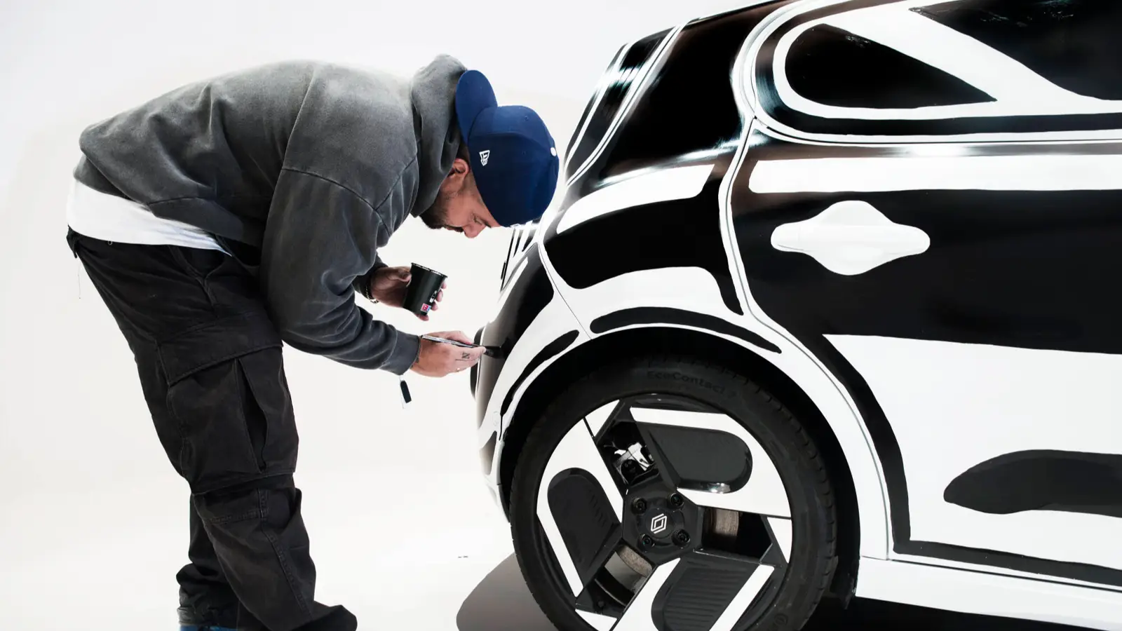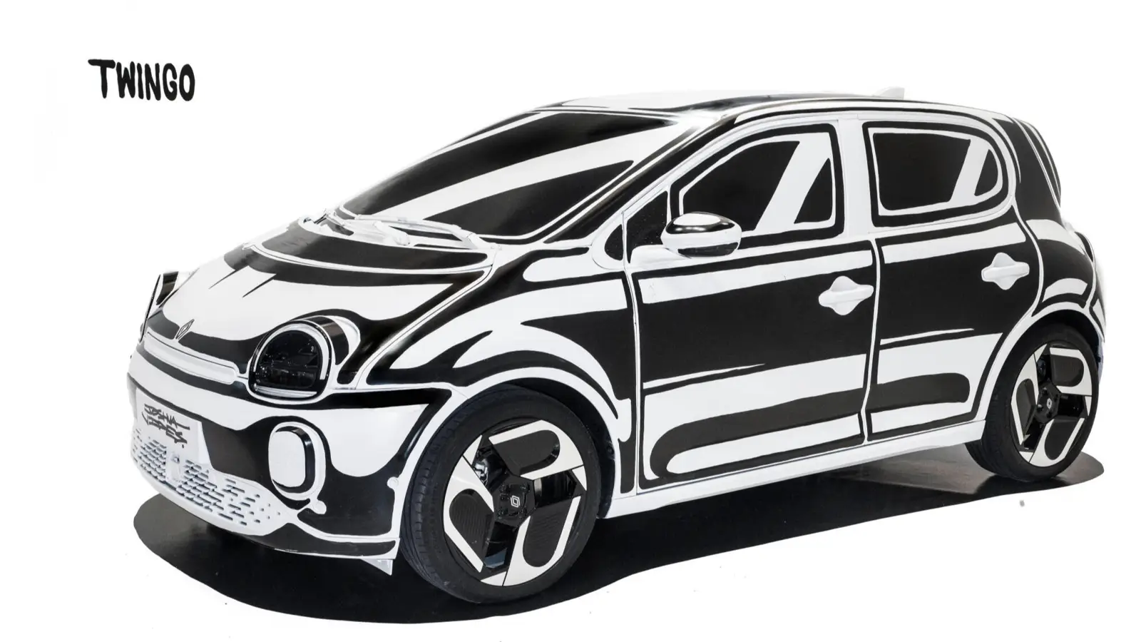 Twingo E-Tech electric stopped being just a car for a few days — in front of a live audience, it turned into a graphic art object that looked like it had stepped out of a comic book. American artist Joshua Vides transformed the electric hatchback by hand over five days, applying his signature black-and-white style that blurs the line between drawing and reality.
