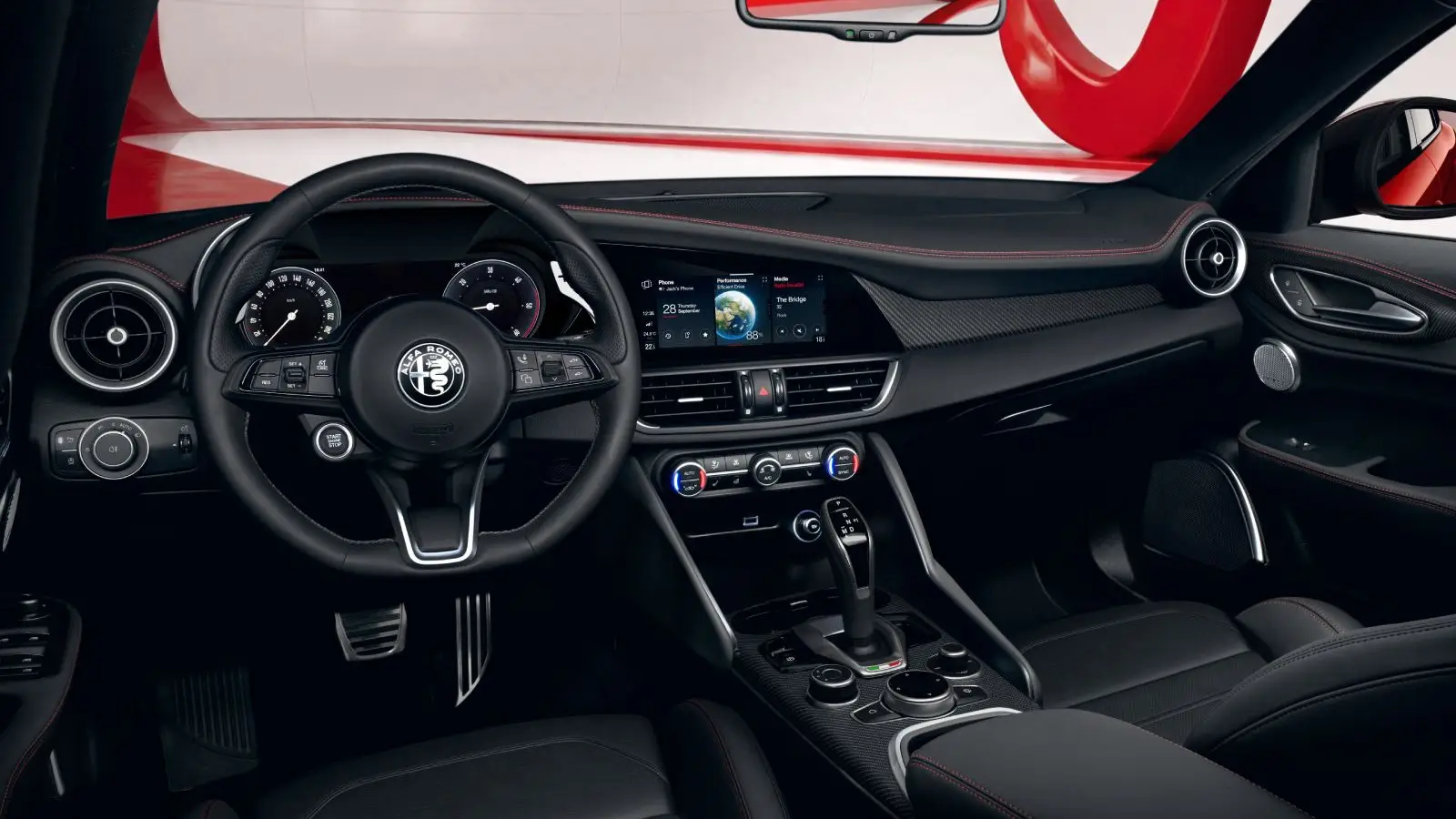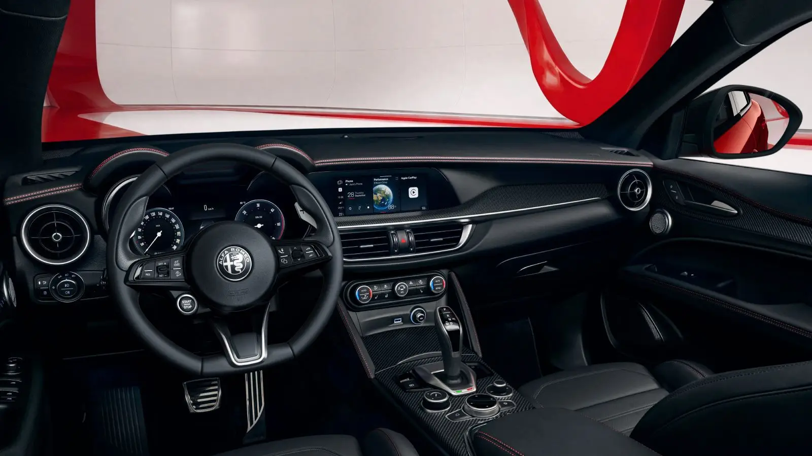 The update centers on experience rather than output. Inside, black leather with red stitching and carbon-fiber trim reinforce the brand’s racing identity. These elements are paired with a 900-watt Harman Kardon audio system featuring 14 speakers and Logic 7 Surround technology, designed to deliver a balanced, immersive sound environment throughout the cabin regardless of seating position.