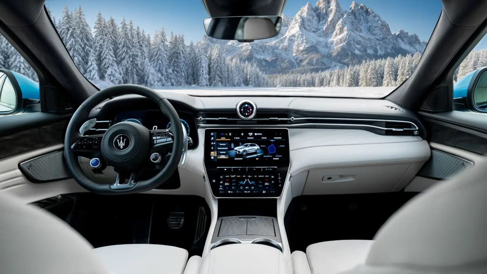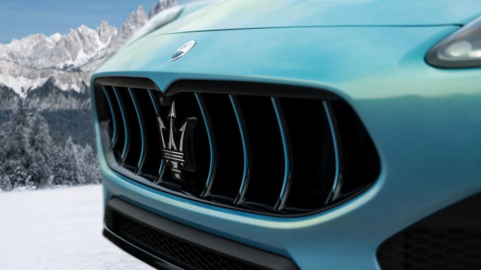 The Grecale Cristallo draws its inspiration from Monte Cristallo, a prominent Dolomite mountain massif known for its light-colored rock and distinctive interaction with natural light. This reference shapes the identity of the special edition, most notably through the introduction of Azzurro Aureo, a new exclusive colour developed under the Maserati Fuoriserie program and identified by a dedicated badge on the bodywork. The shade blends a cool blue base with subtle golden mica, creating a finish that shifts in tone depending on lighting conditions.