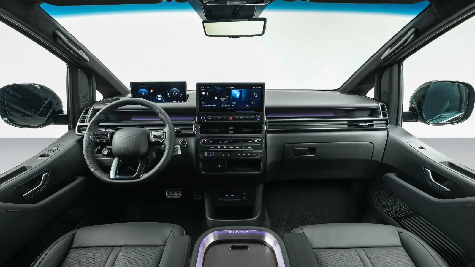 As the first fully electric version of the STARIA, the model positions itself as a flagship in the multi-purpose vehicle segment. Its exterior reflects that ambition: a smooth, grille-free front, a full-width light signature and pixel-style LED rear lights create a distinct electric identity. At the same time, the tall body, long wheelbase and wide twin sliding doors leave no doubt that interior space is the vehicle’s core priority.