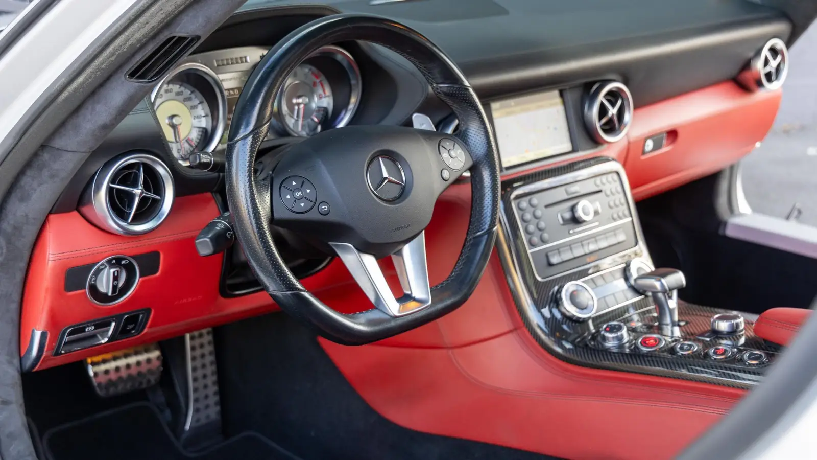 Finished in Iridium Silver Metallic over a Classic Red interior, the car is equipped with carbon fiber interior trim, heated seats, a Bang & Olufsen surround sound system, a limited-slip differential, and staggered factory wheels. According to the seller, the car remains unmodified, a detail that continues to play a major role in the desirability of early SLS AMG examples.