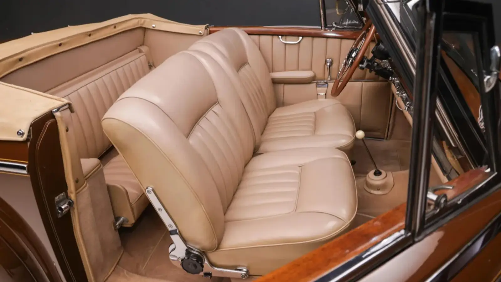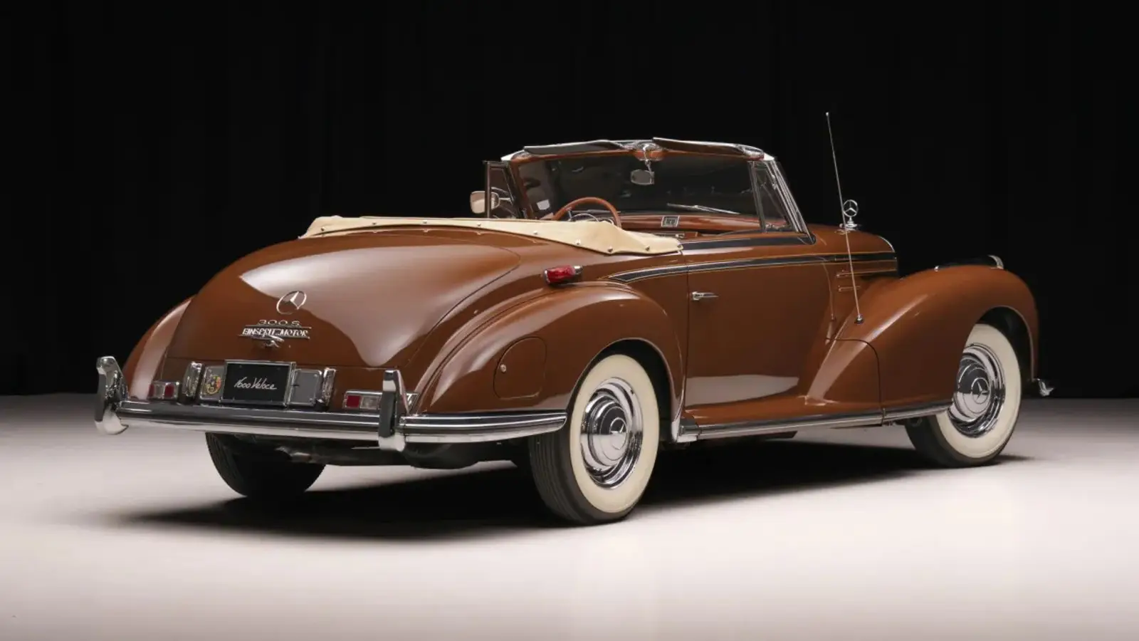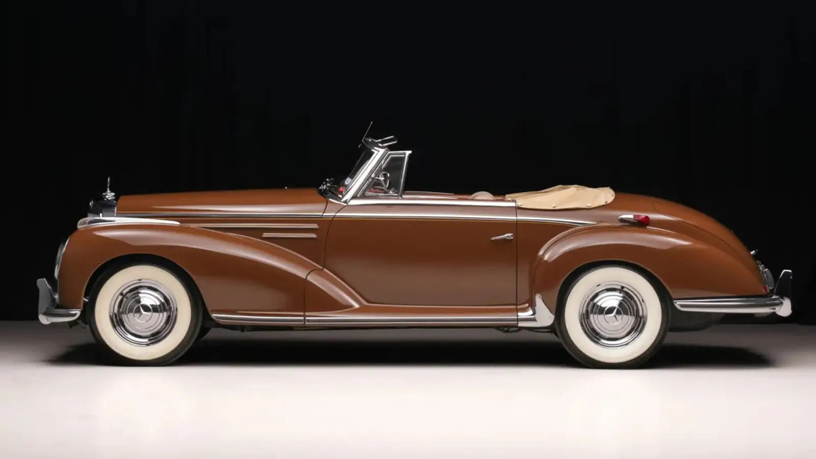 The roadster was refurbished before being acquired by the selling dealer in 2025. It is finished in Tobacco Brown over a cream leather interior and comes equipped with features including a Becker Mexico radio, wood trim throughout the cabin, and a tan convertible top. The sale also includes fitted luggage, spare parts, literature, and a tool roll.