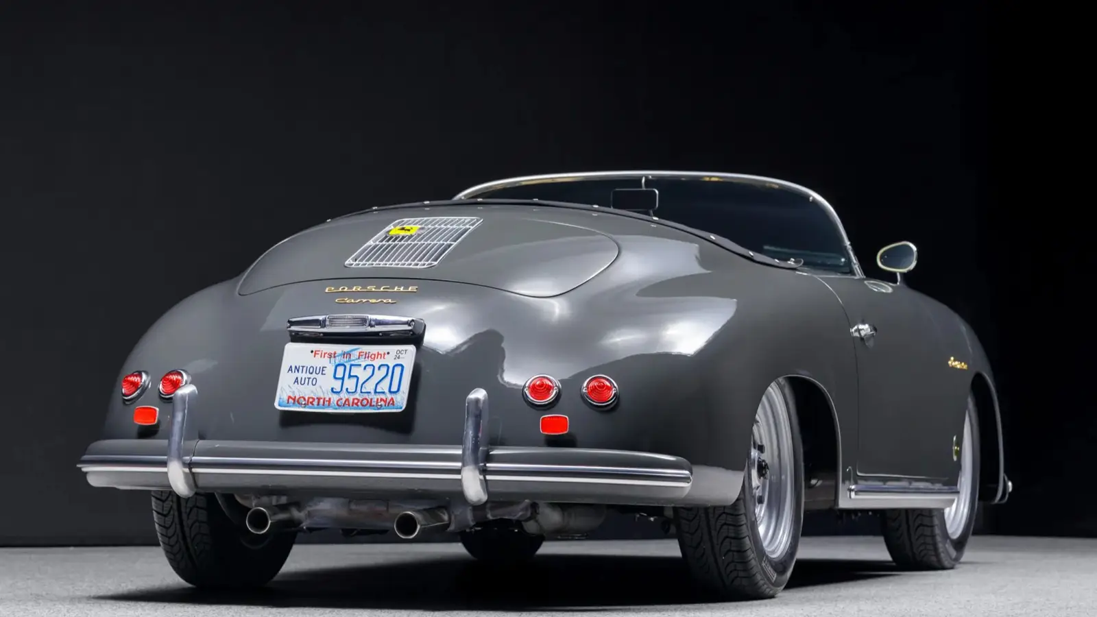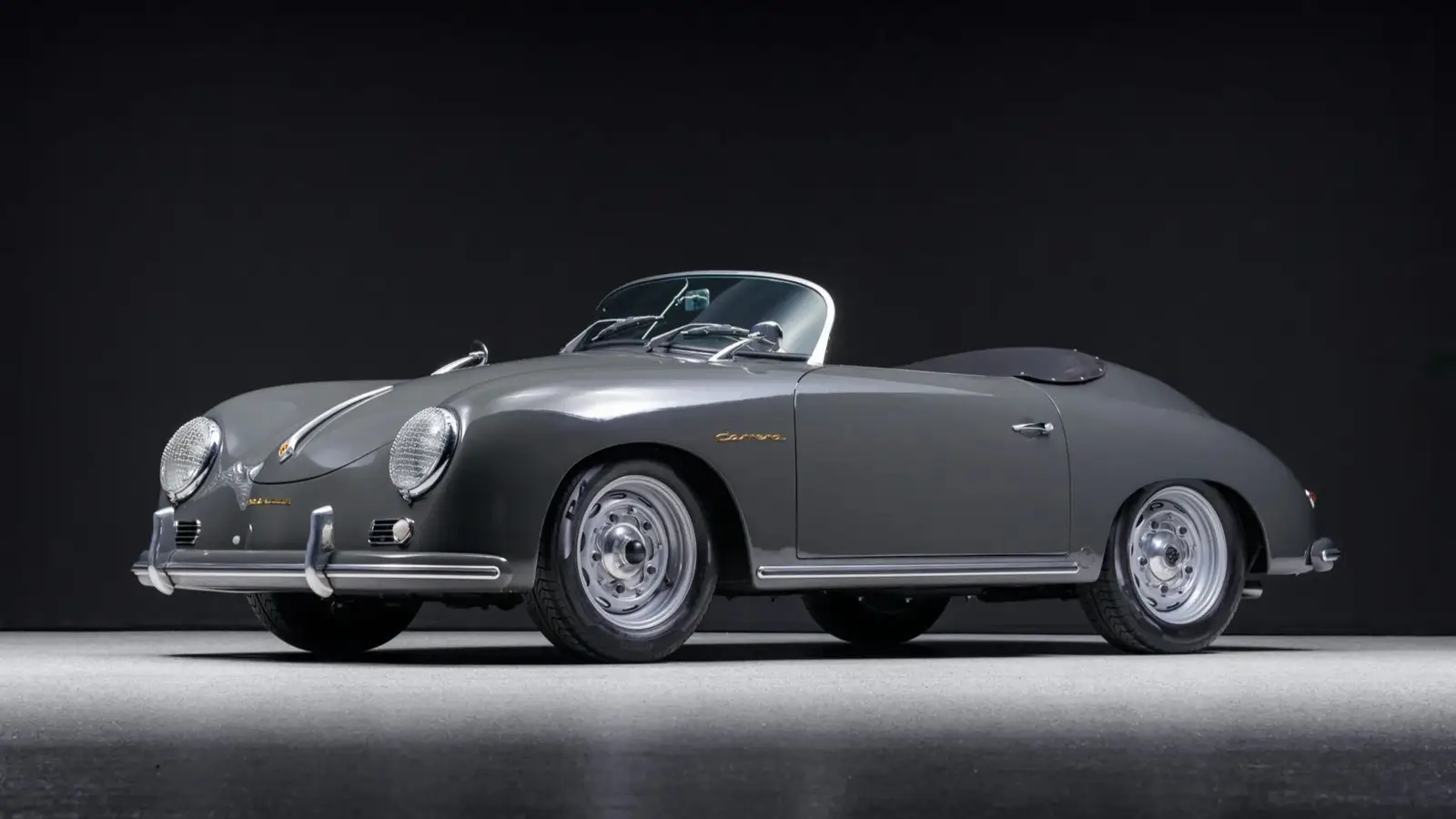 The fiberglass body is finished in Slate Grey (6001), a color historically associated with mid-century Porsche palettes. Exterior details include a black soft top, chrome bumpers with overriders, headlight grilles, and beehive-style taillights. Fifteen-inch wide-five wheels are fitted with Pirelli P4 Four Seasons tires in 185/65 size.