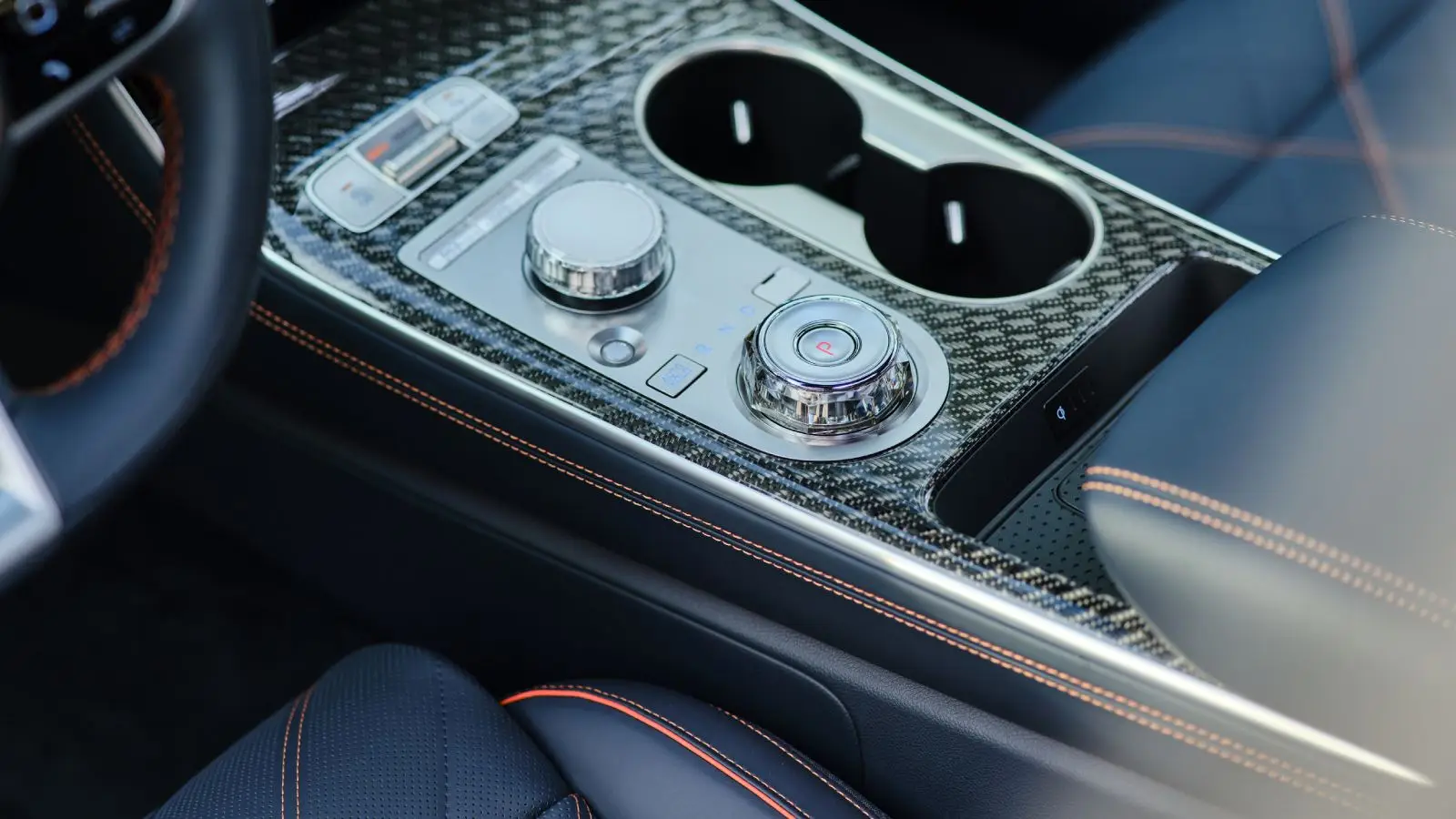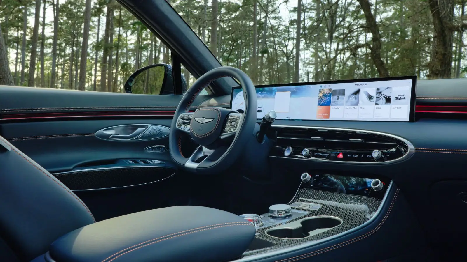 Step inside, and the story flips. The cabin is where the 2026 GV70 really shows its hand: the dashboard sits lower and flatter, and a single 27-inch display now stretches across the fascia in place of the previous split setup. Just as important, it doesn’t force you into an all-screen lifestyle—there’s still a dedicated space for climate controls and a backup physical dial/controller, a combination that simply makes more sense when you’re driving.
