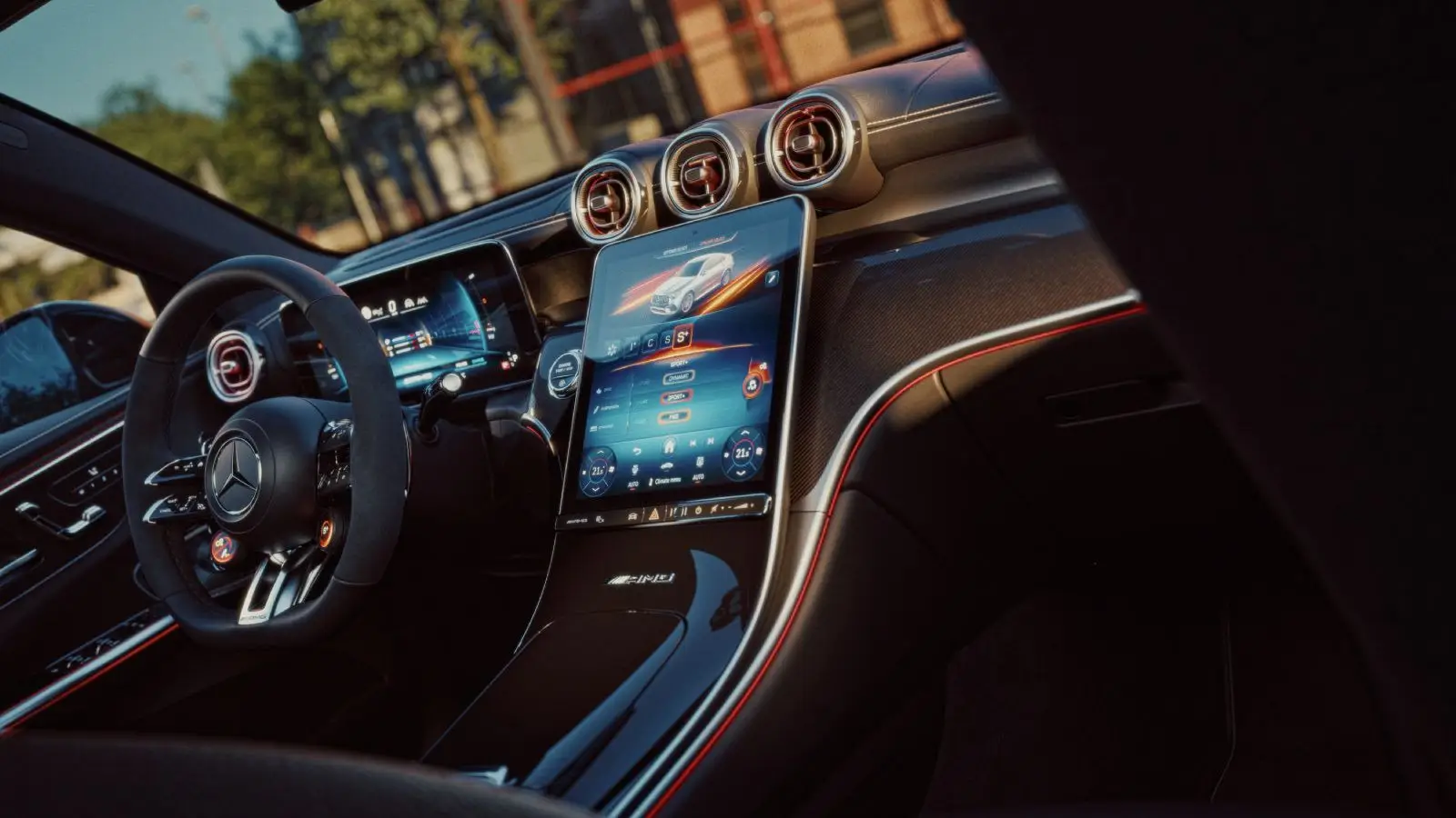 Traction is managed by the fully variable AMG Performance 4MATIC+ all-wheel-drive system. Under moderate conditions, the front axle can be fully decoupled for improved efficiency. In sportier settings, torque distribution shifts rearward. With Drift Mode – available as part of the AMG DYNAMIC PLUS Package – the vehicle effectively operates as rear-wheel drive, a function intended for use on closed tracks.