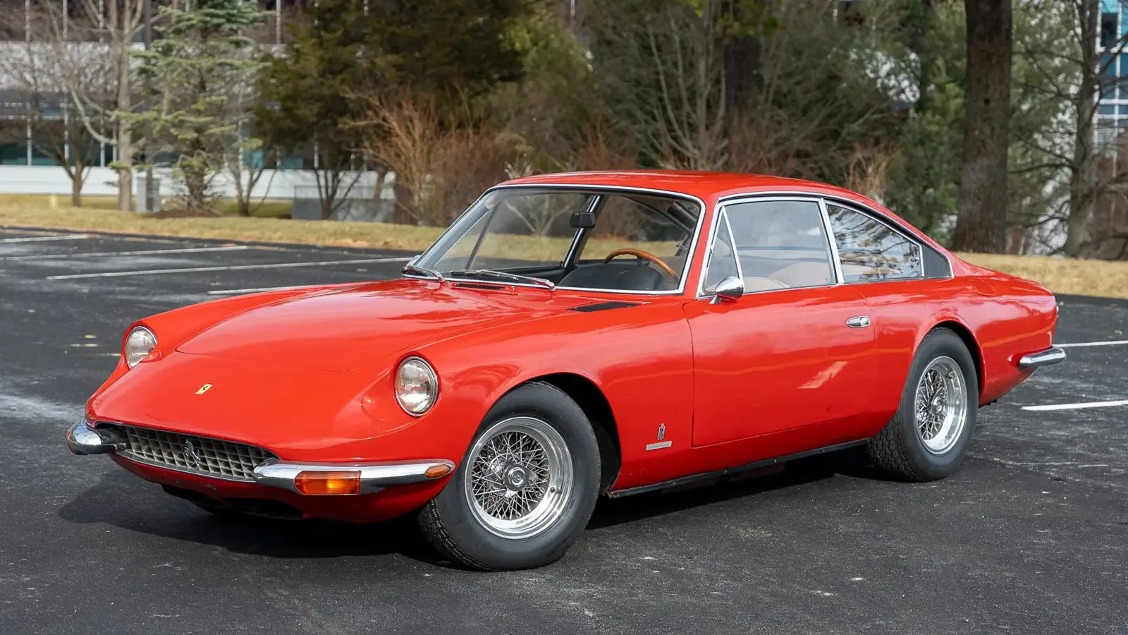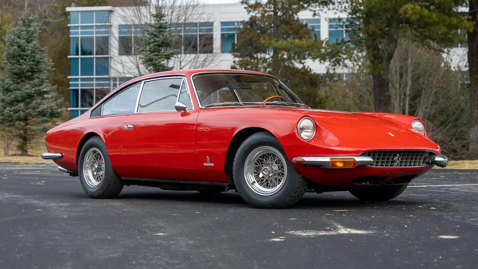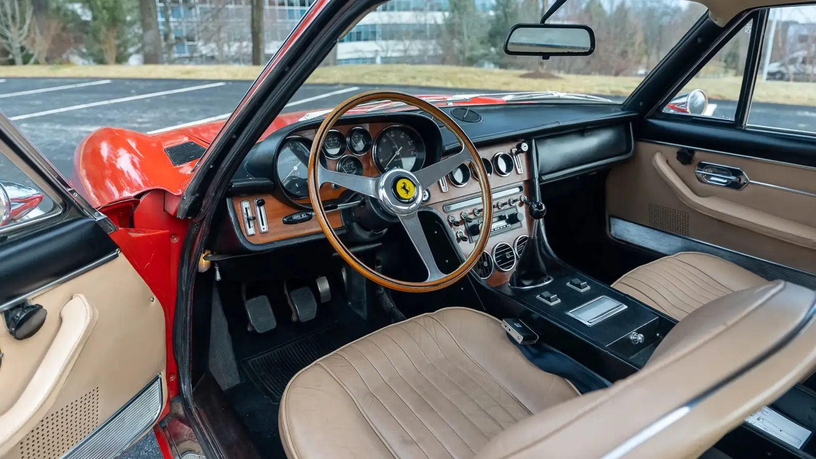 This example is finished in red over beige Connolly leather and is equipped with features that highlight the car’s grand touring focus. The listing mentions 15-inch Borrani wire wheels, four-wheel ventilated disc brakes, power steering, air conditioning, a Craig cassette stereo, and power windows. It is also noted to have a self-leveling independent rear suspension, a technical detail often associated with the 365 GT 2+2’s engineering approach.
