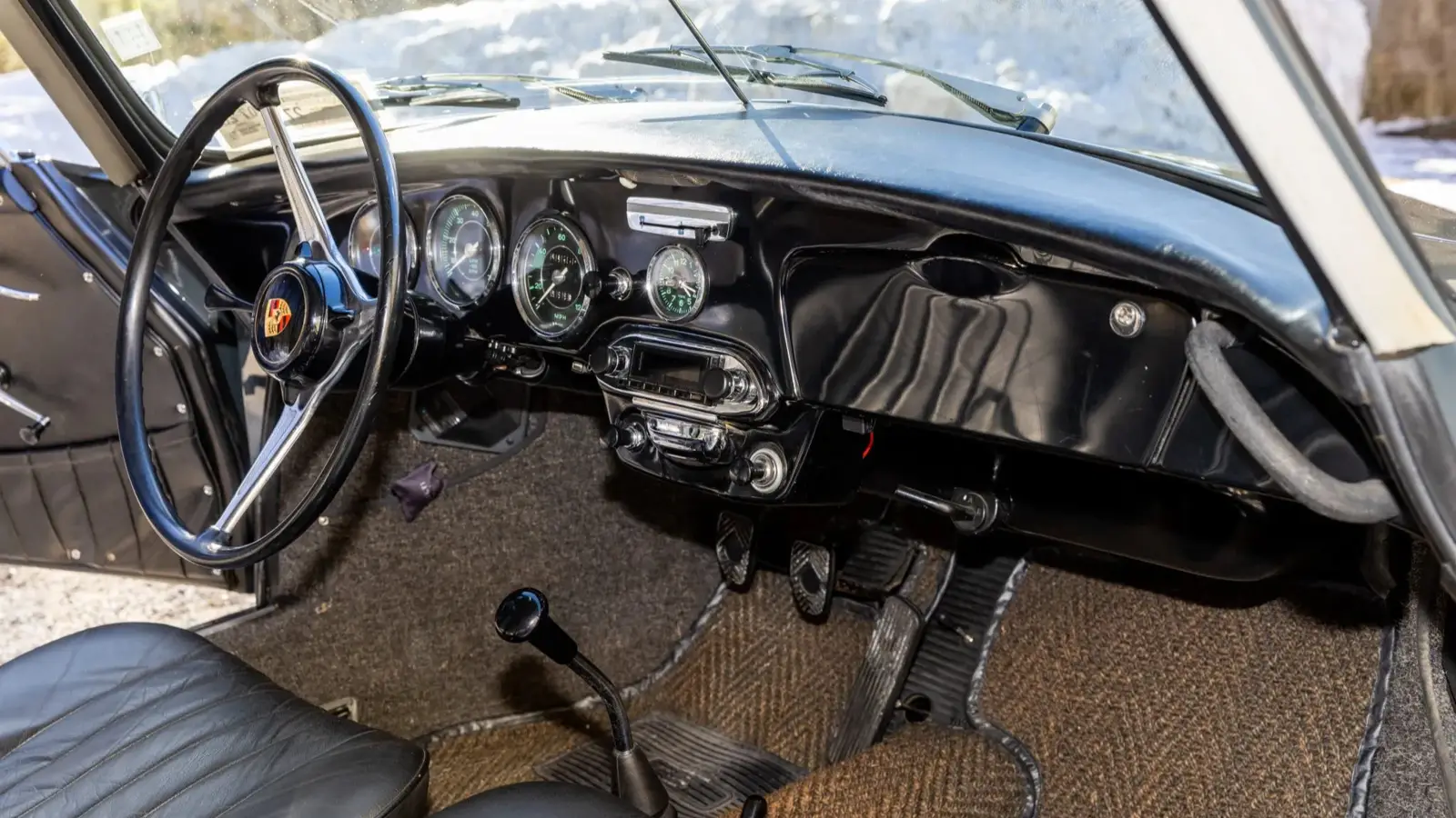 The body was built by Reutter, Porsche’s long-time coachbuilding partner for the 356. Equipment includes 15-inch steel wheels with hubcaps, a black soft top, black leather upholstery, and VDO instrumentation featuring a centrally mounted tachometer with a 6,000-rpm redline. The five-digit odometer shows approximately 7,000 miles, though total mileage is unknown.