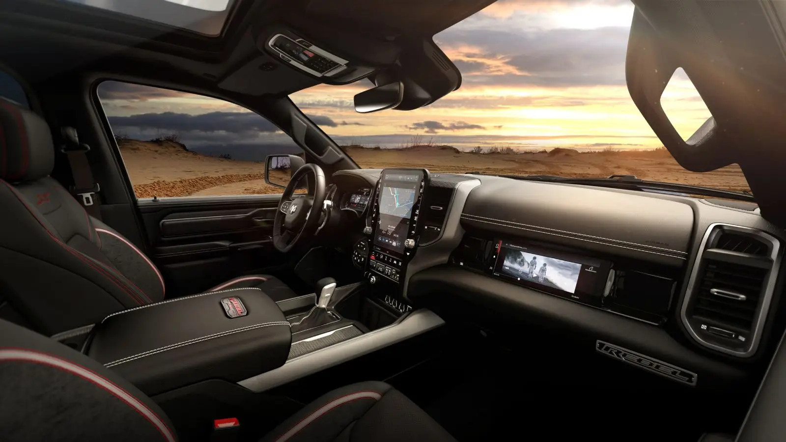 Comfort and technology remain central to the Rebel X formula. Level 2 features include a 12.3-inch digital instrument cluster, a massive 14.5-inch Uconnect 5 touchscreen, and a 19-speaker Harman Kardon premium audio system. The truck also offers a 10.25-inch front passenger interactive display and dual wireless charging pads, along with heated and ventilated front seats, heated rear seats, and a heated leather steering wheel.