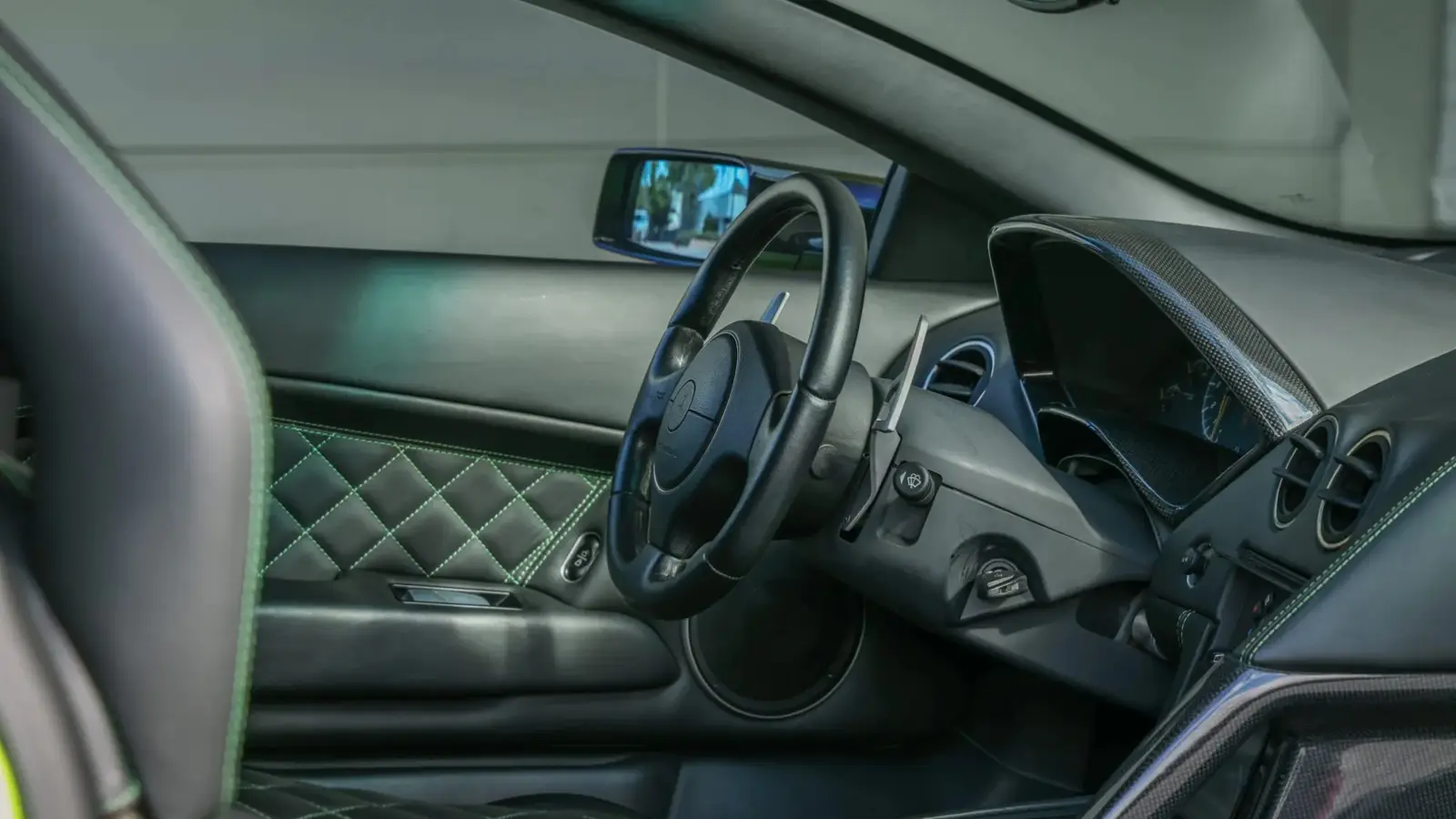 This particular car is finished in Verde Ithaca, a vivid green shade identified in paint documentation under code 0077. Paired with black leather upholstery and bright green stitching, the specification creates a striking visual statement that BaT describes as “stands out.” Signature scissor doors, a speed-activated rear spoiler, and automatically deploying rear air intakes complete the dramatic exterior presence.