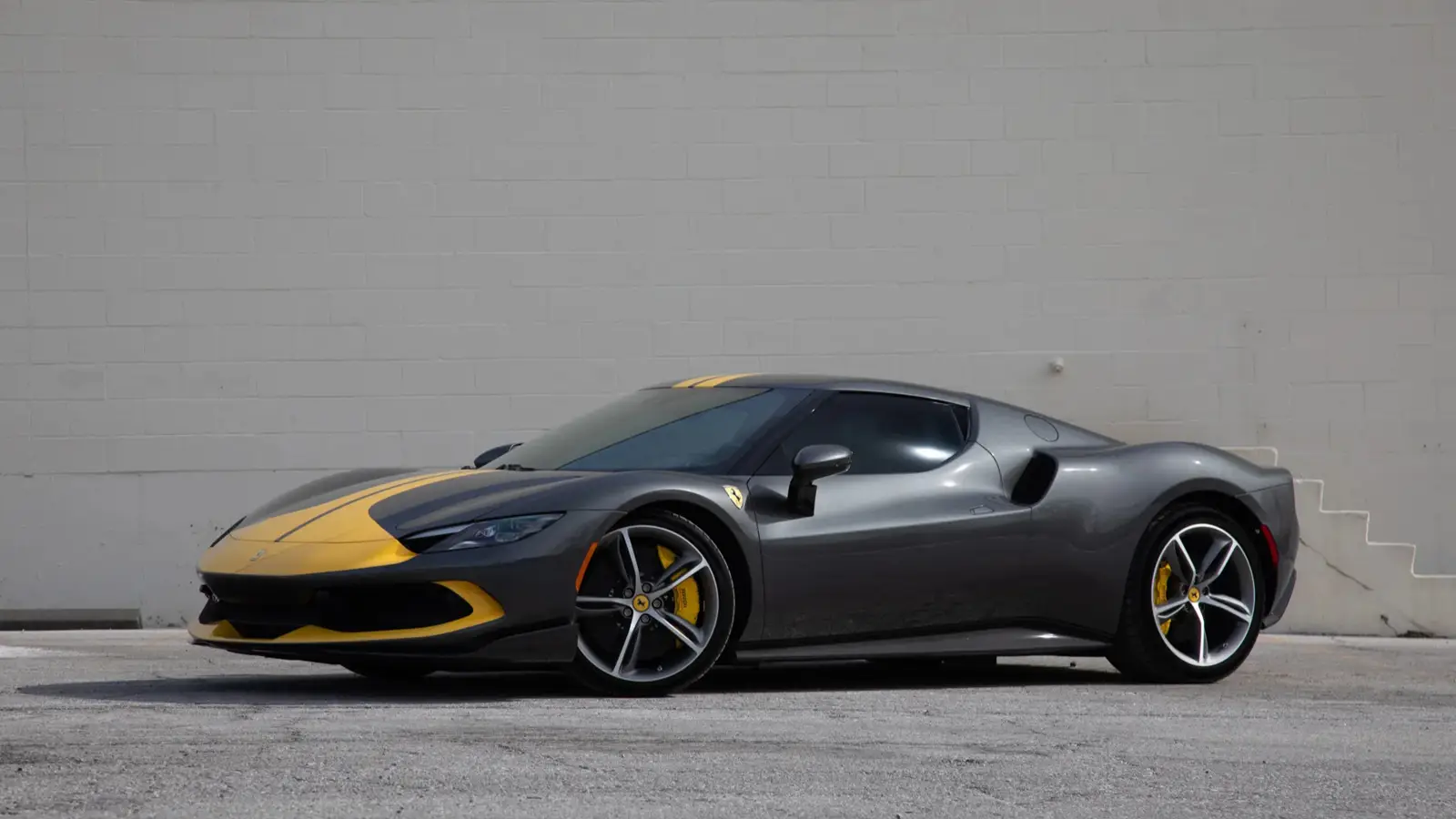 Ferrari introduced the 296 model line for the 2022 model year. The car marked an important milestone for the brand, as it became the first Ferrari-badged road model powered by a six-cylinder engine. Its powertrain combines a 3.0-liter twin-turbocharged F163 V6 with an MGU-K electric motor. Together they produce a combined output of 819 horsepower delivered to the rear wheels through an eight-speed dual-clutch transmission. Electrical energy is stored in a 7.45-kWh battery mounted beneath the cabin floor behind the seats.
