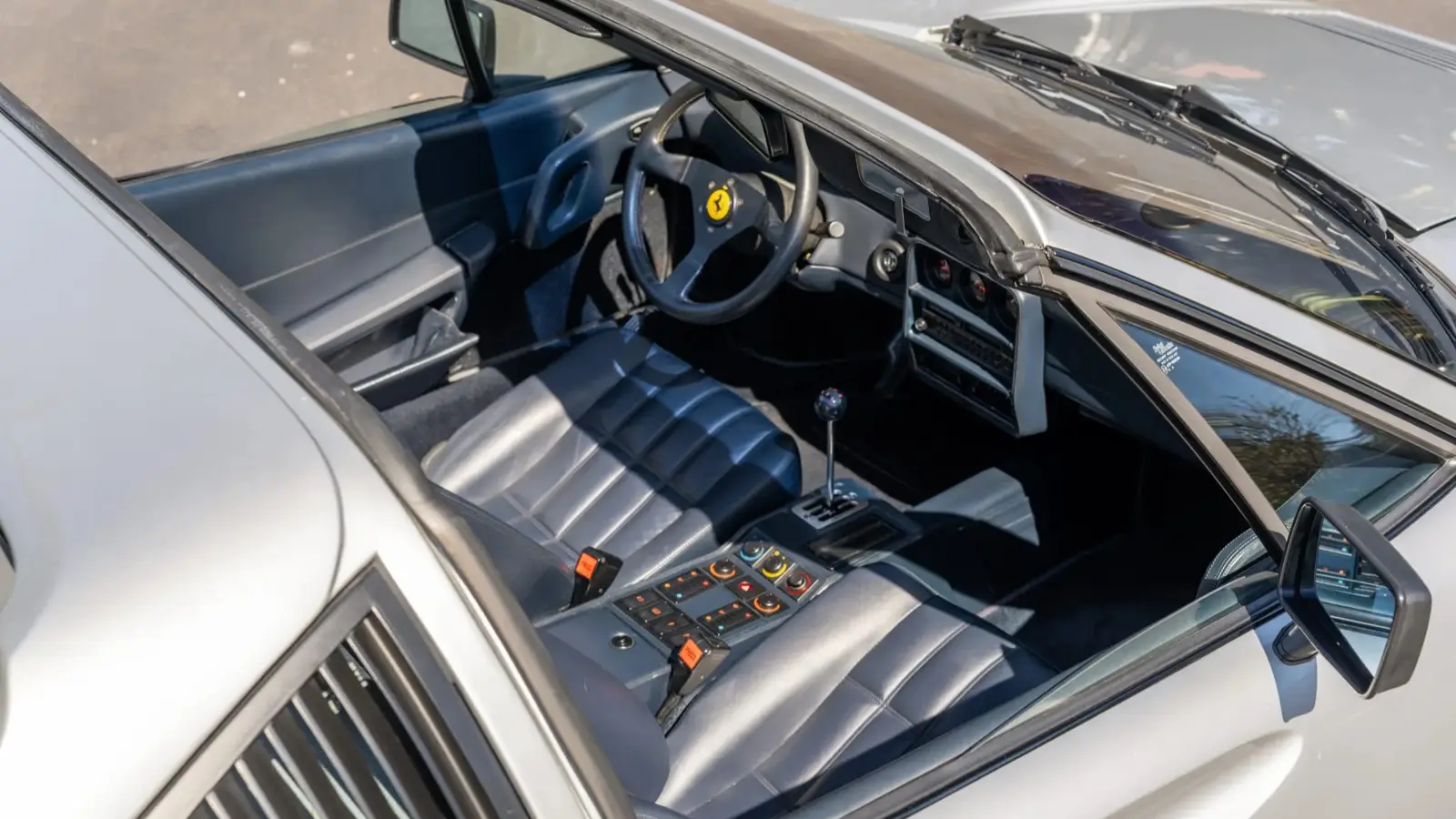 This particular example is finished in Argento Nurburgring Metallizzato and features blue leather upholstery. The body was designed by Pininfarina, and the silver metallic paint highlights the sculpted lines of the 328’s design, including its flowing wheel arches, side air intakes, and wedge-shaped silhouette typical of Italian sports cars from the period. The GTS configuration adds a removable roof panel, allowing the car to be driven in a targa-style open configuration.