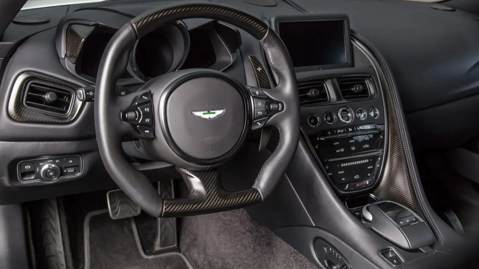 The coupe rides on satin-black 21-inch Ultimate wheels wrapped in Pirelli P Zero tires measuring 265/35 at the front and 305/30 at the rear. Braking is handled by cross-drilled carbon-ceramic discs with black-finished calipers, while the car retains Aston Martin’s Adaptive Damping System.