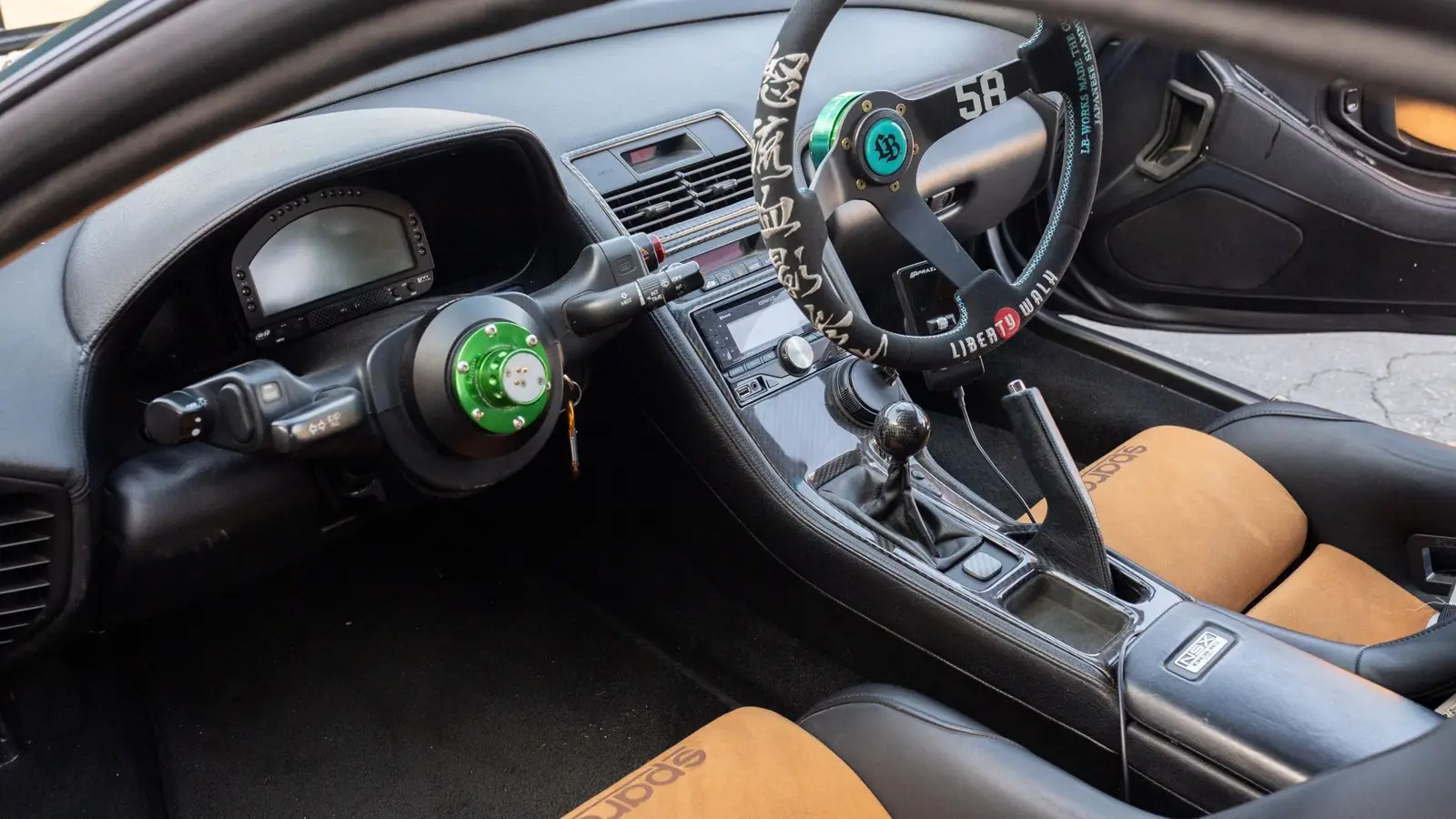 The interior reflects the same custom approach. The cabin includes Sparco racing seats with harnesses, a Liberty Walk steering wheel with a quick-release hub, carbon-fiber trim, and an AiM Sportline MXL modular dash logger. More conventional equipment remains in place as well, including air conditioning, cruise control, and NSX-branded door sill plates.
