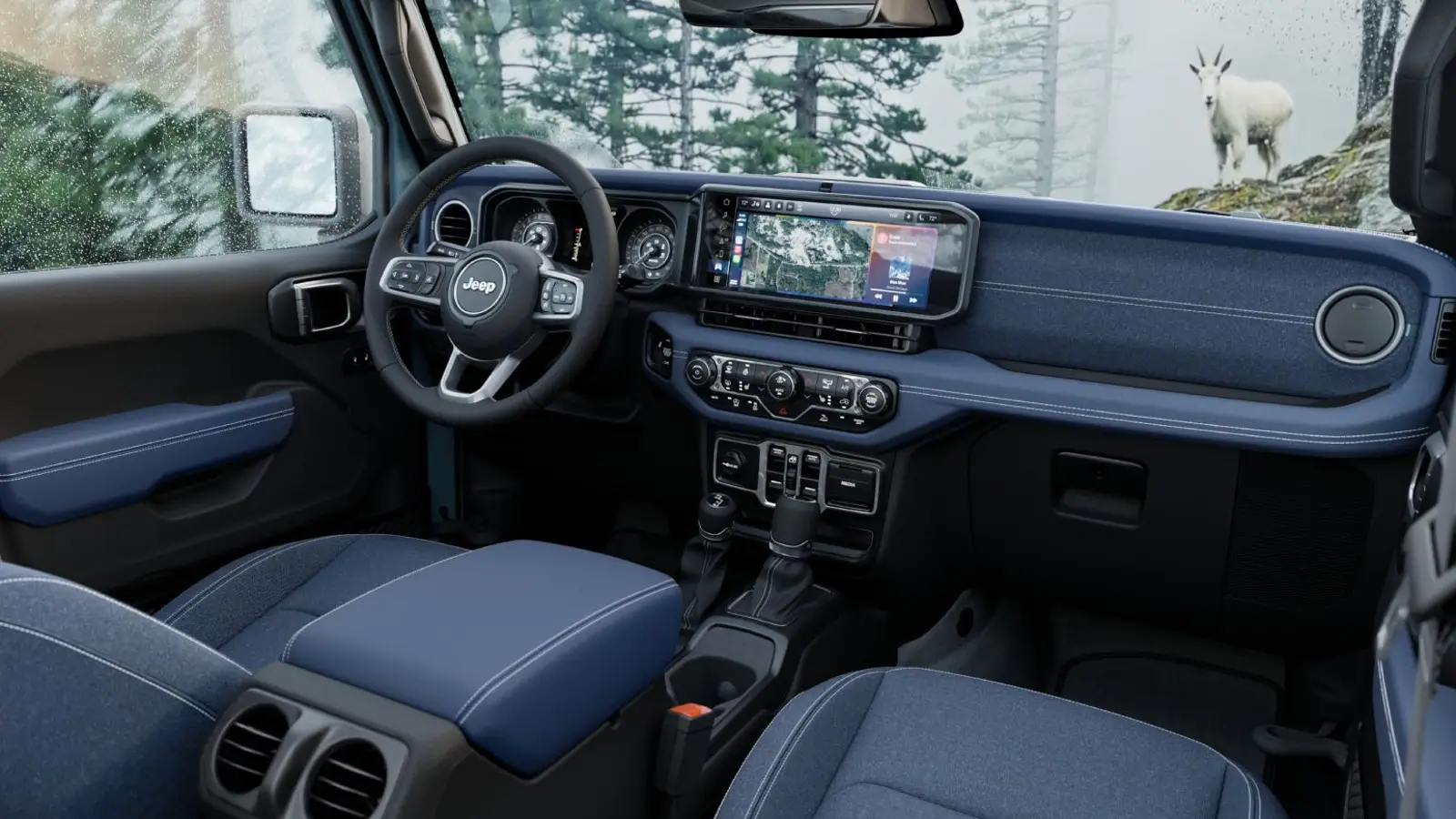The interior continues the same tonal concept. Cabin details feature Indigo Blue accents on the instrument panel surround, center console and door armrests. Contrasting silver stitching highlights the interior design, while the seats are finished in Jean Blue cloth. Unique touches include Rockslide-specific details such as a branded plaque mounted on the swing gate.