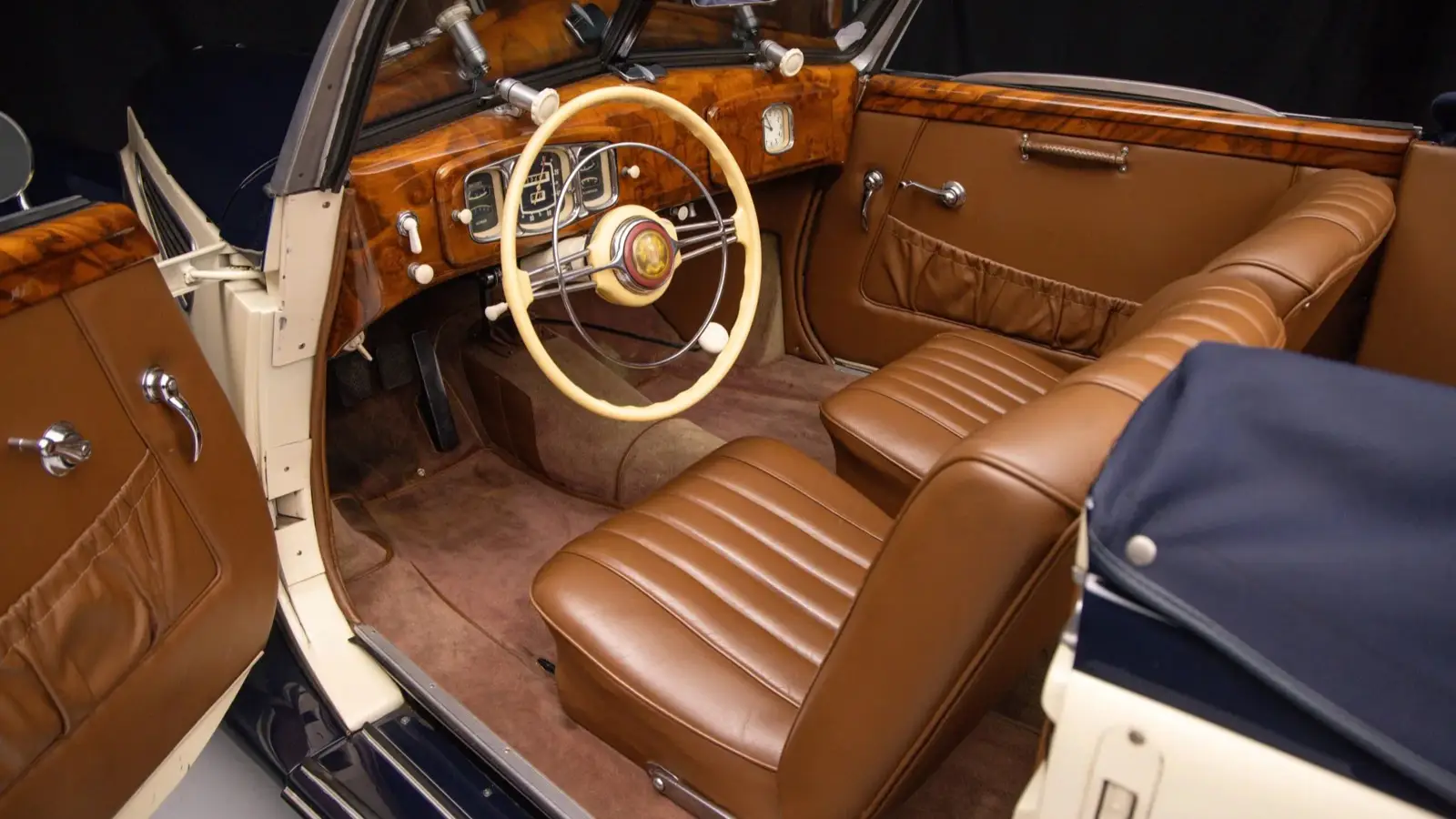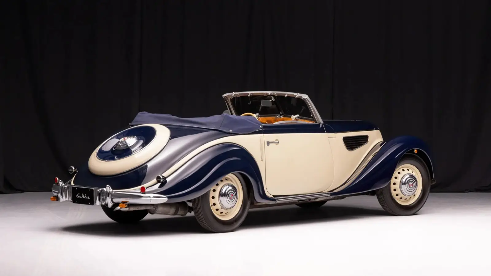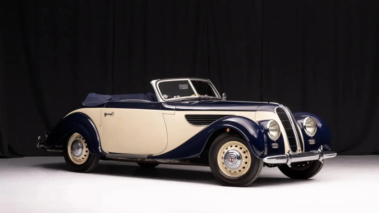 The car offered here is finished in a two-tone combination of dark blue and ivory, complemented by a dark blue convertible top. Inside, the cabin features tan leather upholstery in a 2+2 seating layout along with a wooden dashboard and an ivory two-spoke steering wheel. Equipment includes hydraulic drum brakes at all four corners and 16-inch steel wheels wearing EMW-branded hubcaps.