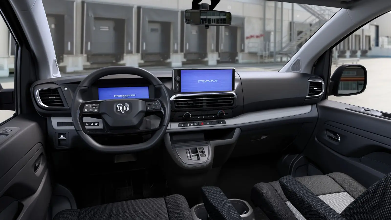 Inside the cabin, the ProMaster City introduces technology that is uncommon for vehicles in this segment. Standard equipment includes a 10-inch digital instrument cluster, a 10-inch touchscreen infotainment system with Apple CarPlay and Android Auto, and a digital rearview mirror designed to improve visibility when the cargo area is full.