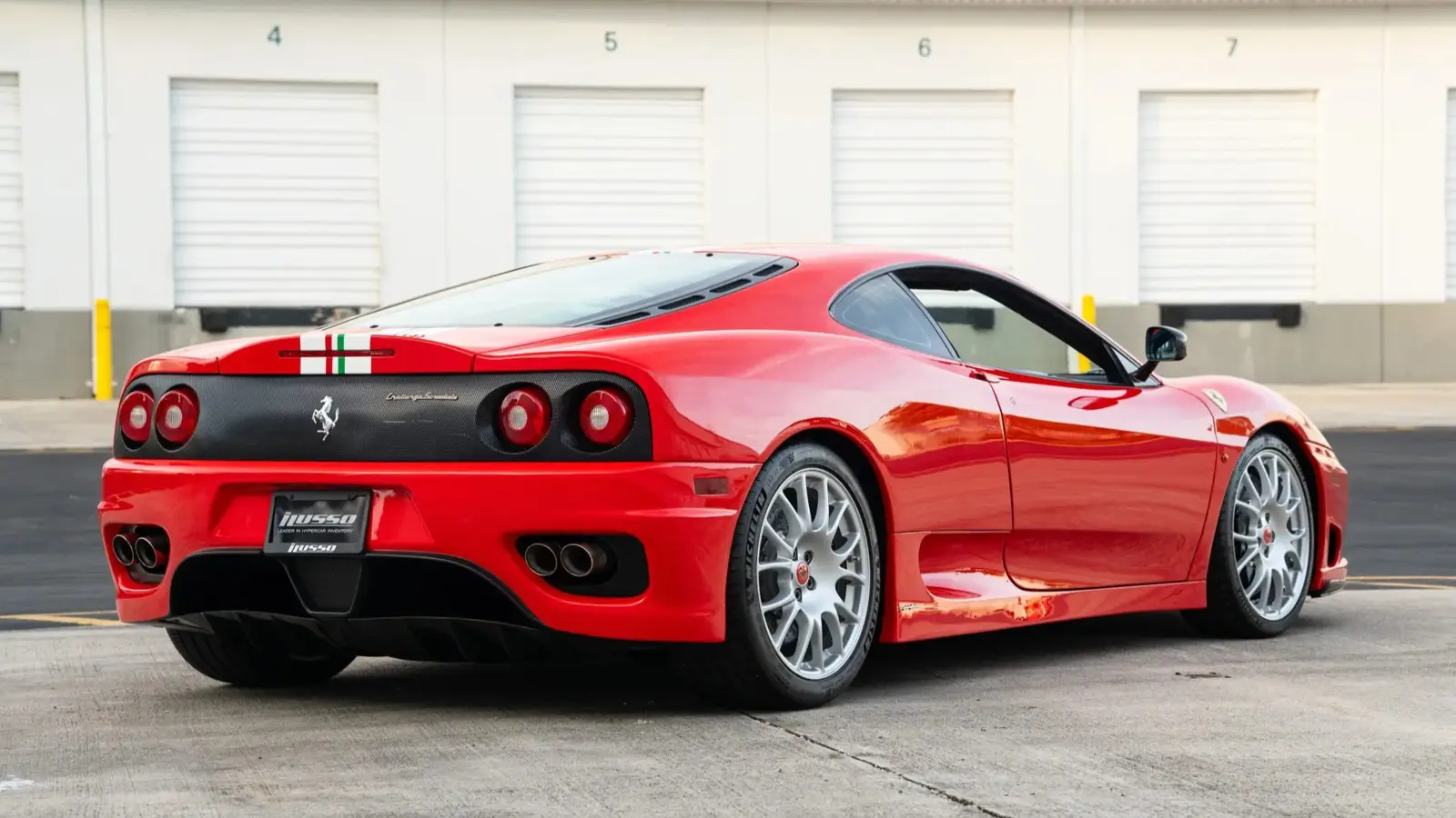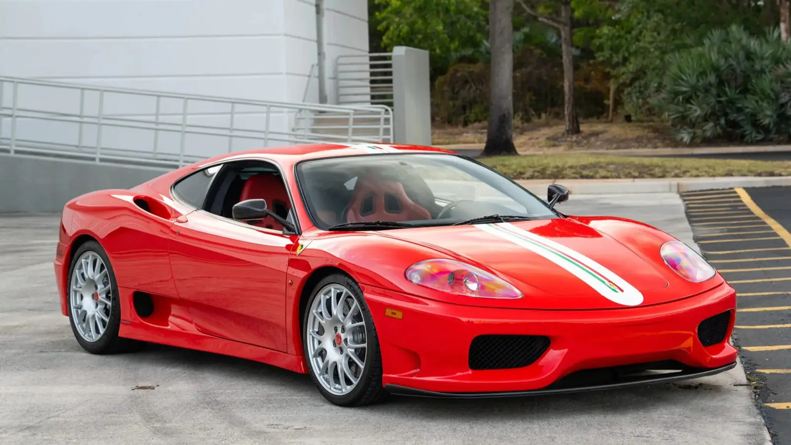 Bring a Trailer reports a 9k-mile 2004 Ferrari 360 Challenge Stradale offered at auction, featuring Rosso Scuderia paint, factory racing livery and 3.6-liter V8 power.