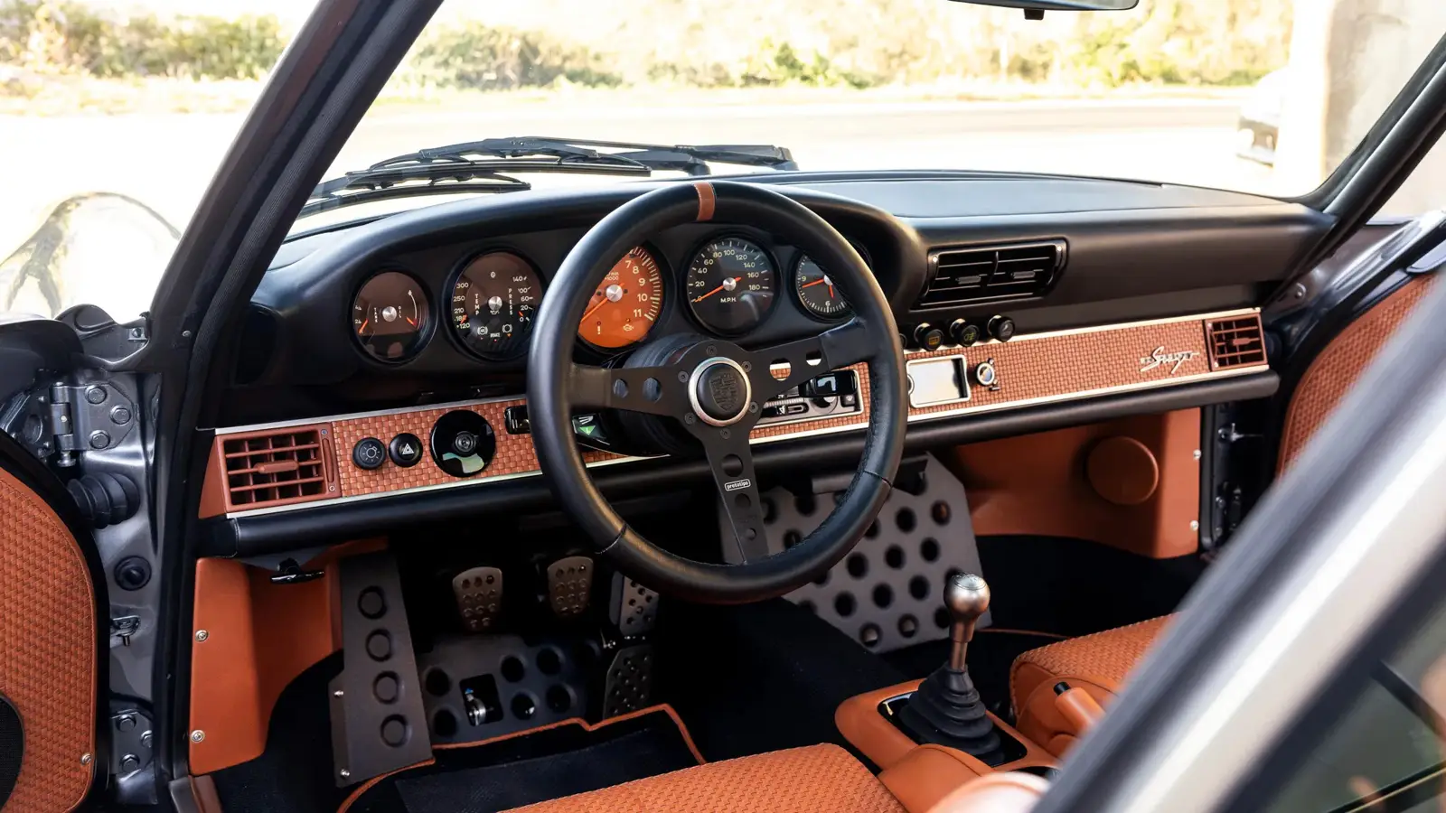 This particular example stands out for its precise configuration. It is finished in paint-to-sample Pure Gunmetal with subtle ghost stripes, paired with a richly detailed Turmeric leather interior featuring woven inserts and nickel-plated accents. Inside, it combines Recaro seats, a MOMO steering wheel, and a Porsche Classic navigation system, blending vintage aesthetics with modern usability.