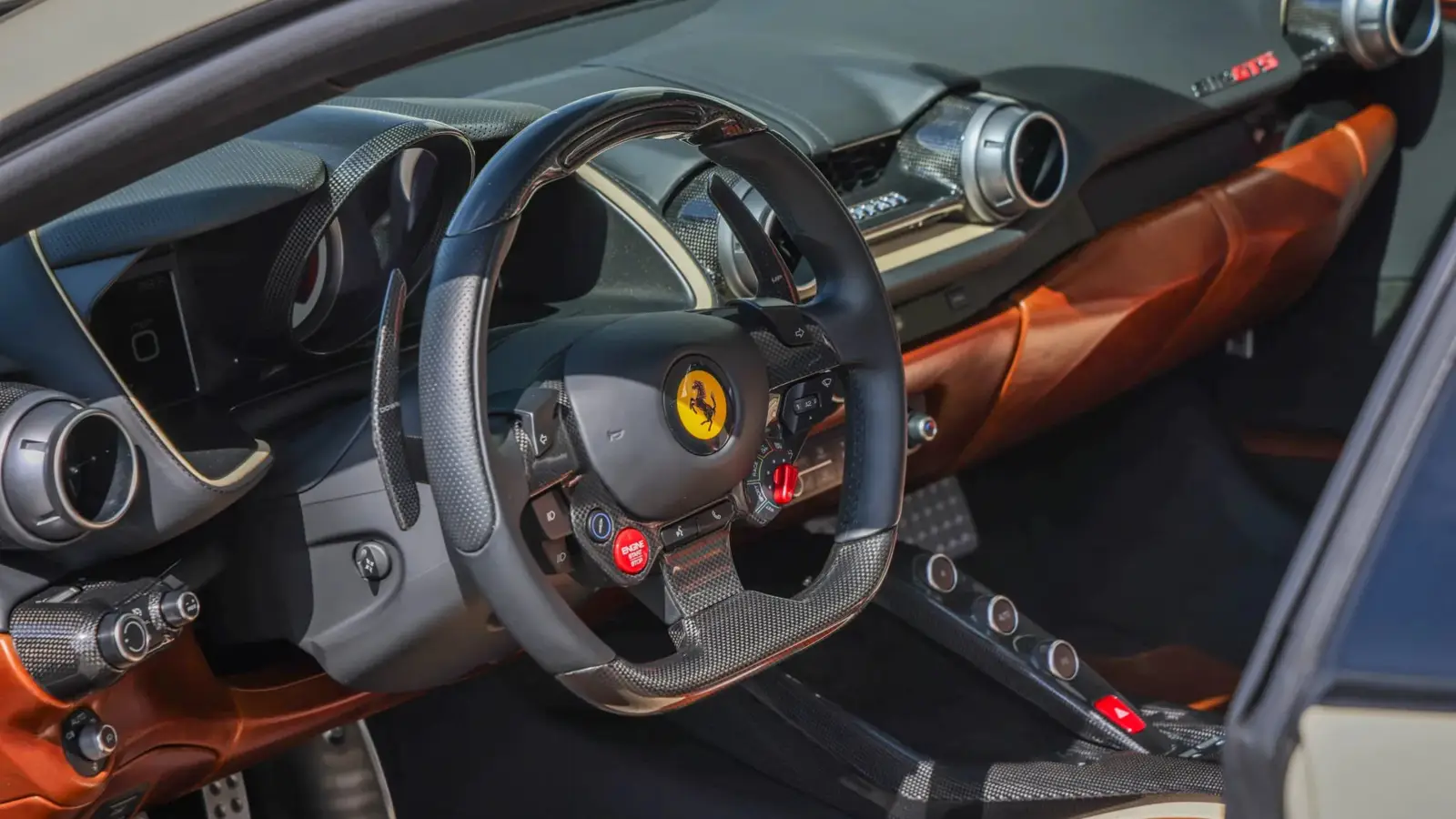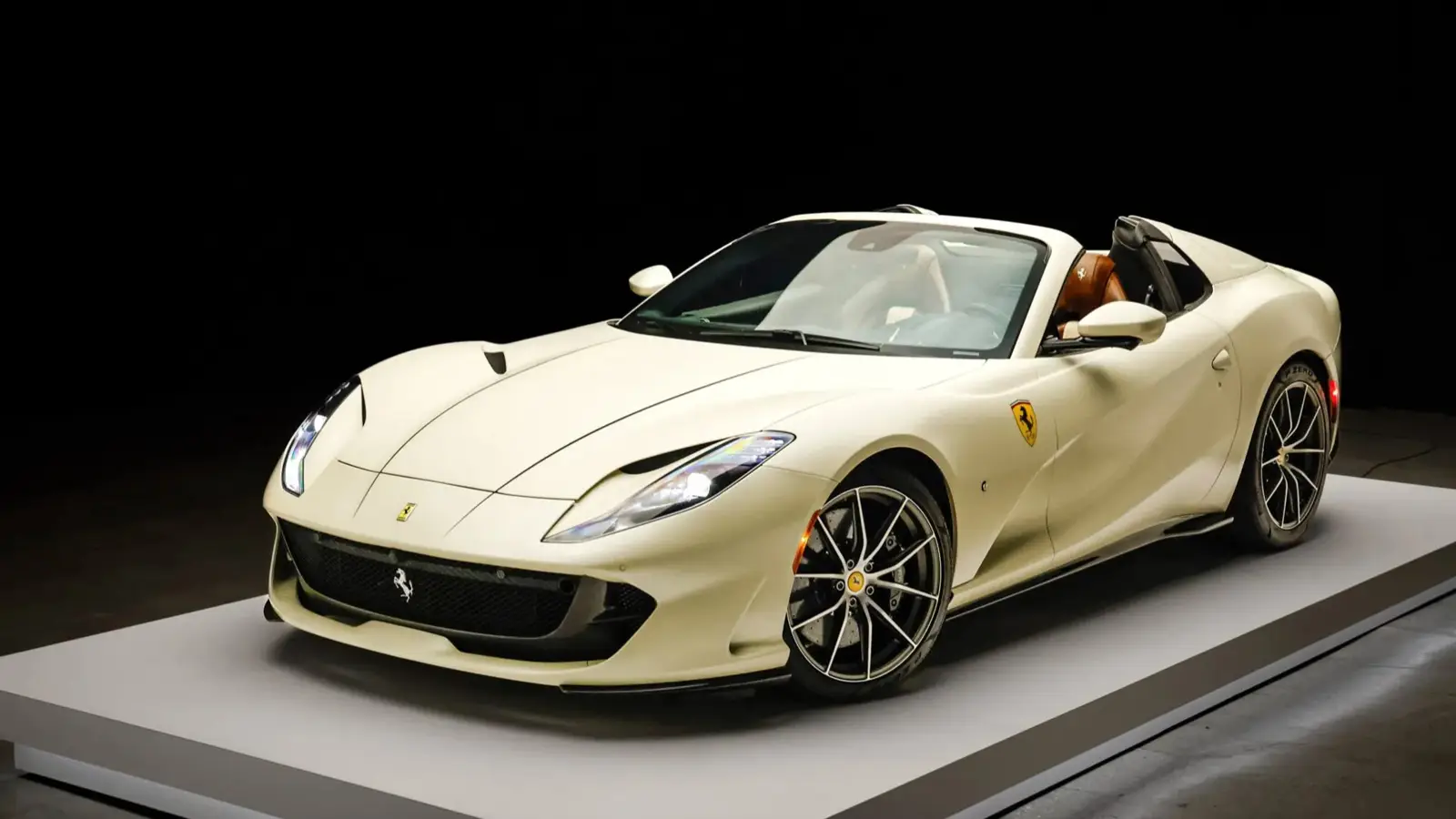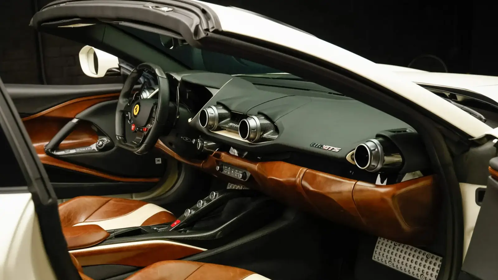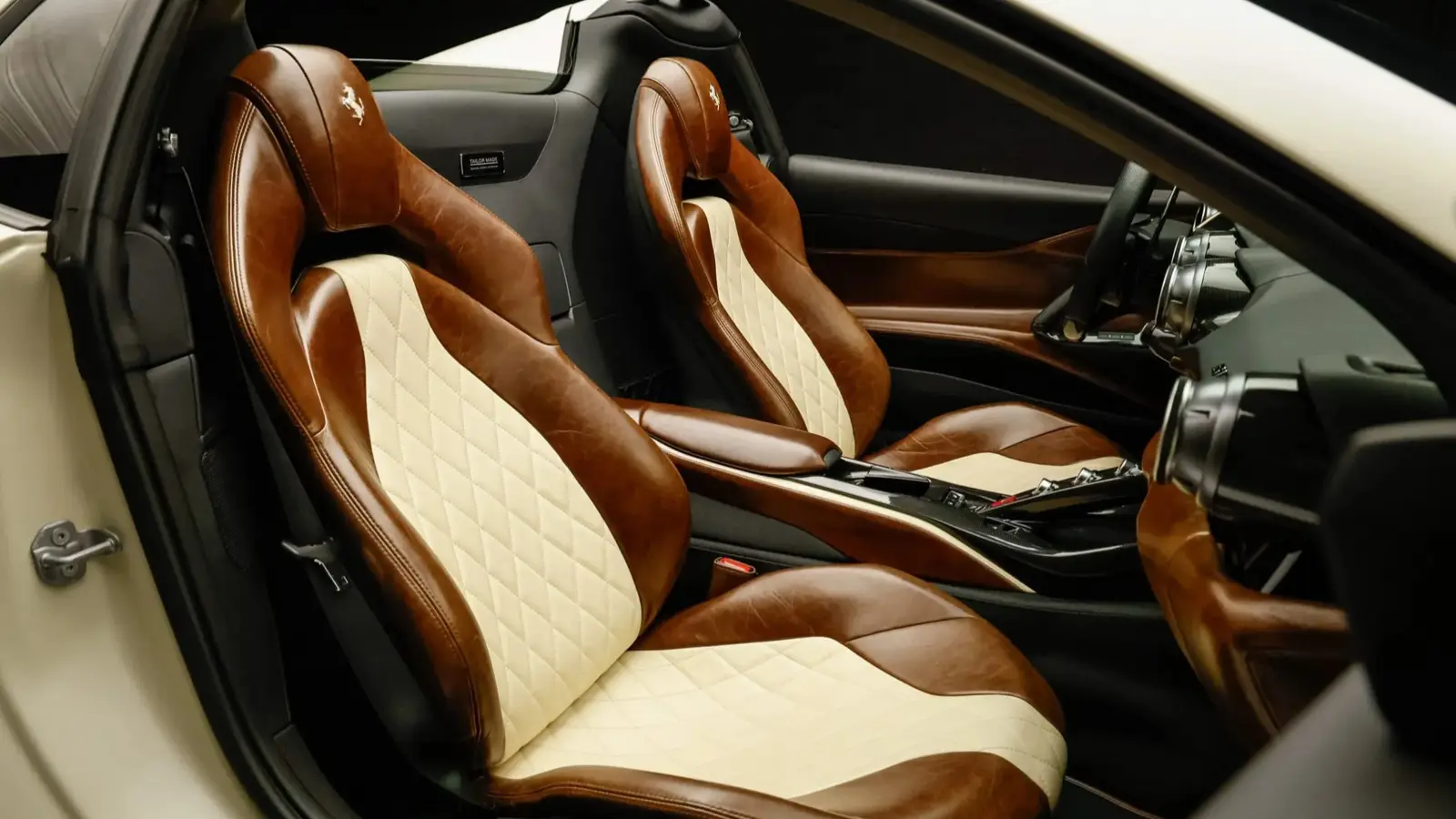 This example was created through Ferrari’s Tailor Made program, the brand’s most exclusive level of personalization. It stands out not only for its Matte Bianco Lagos exterior with Matte Nero Fiammato stripes, but also for its remarkably crafted interior. Poltrona Frau Heritage Walnut leather is paired with Connolly Vaumol Luxan Cream inserts in a diamond-stitched pattern, creating a cabin that feels closer to a classic grand tourer than a modern supercar. Carbon-fiber trim and Tailor Made plaques complete a space defined by material richness and careful design.