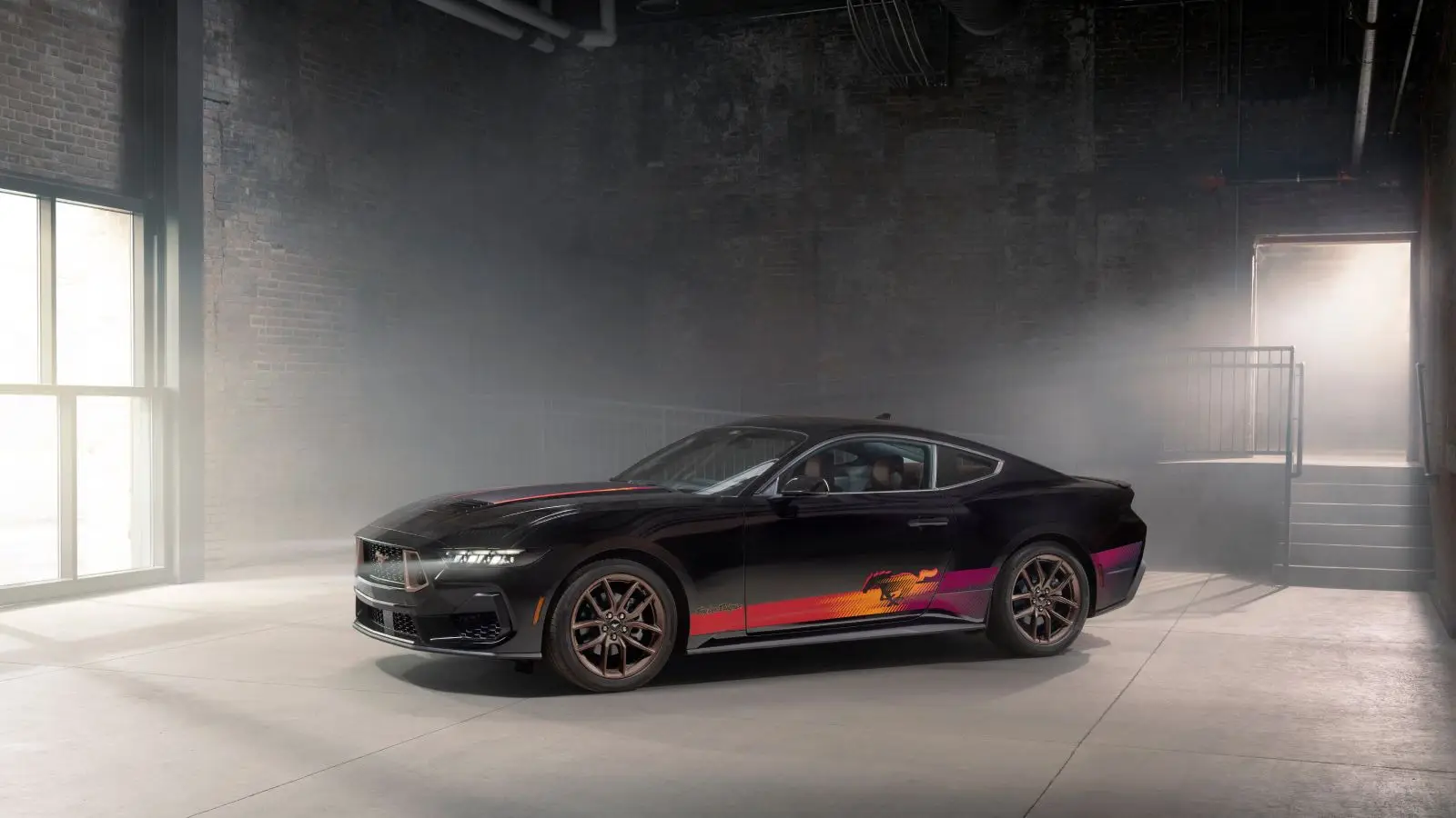 Visual identity is central to the package. Bright red, orange, purple, and yellow graphics are integrated into the bodywork, reinterpreting the iconic Mustang pony emblem. The car is offered exclusively in Shadow Black, enhancing contrast, while details such as the 19-inch wheels and grille accents are finished in Sinister Bronze. Inside, the cabin features Carmine Red trim along with a serialized badge.