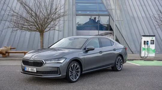 The electric motor continues to deliver 85 kW, and the traction battery retains its 25.7 kWh gross capacity. The hybrid architecture combines a six-speed automatic transmission with an integrated electric motor, while the fuel tank holds 45 litres. According to the manufacturer, the latest-generation Superb iV offers an electric driving range of more than 100 km under WLTP, with some publications citing figures of up to 84 miles. The model supports both AC and DC charging.