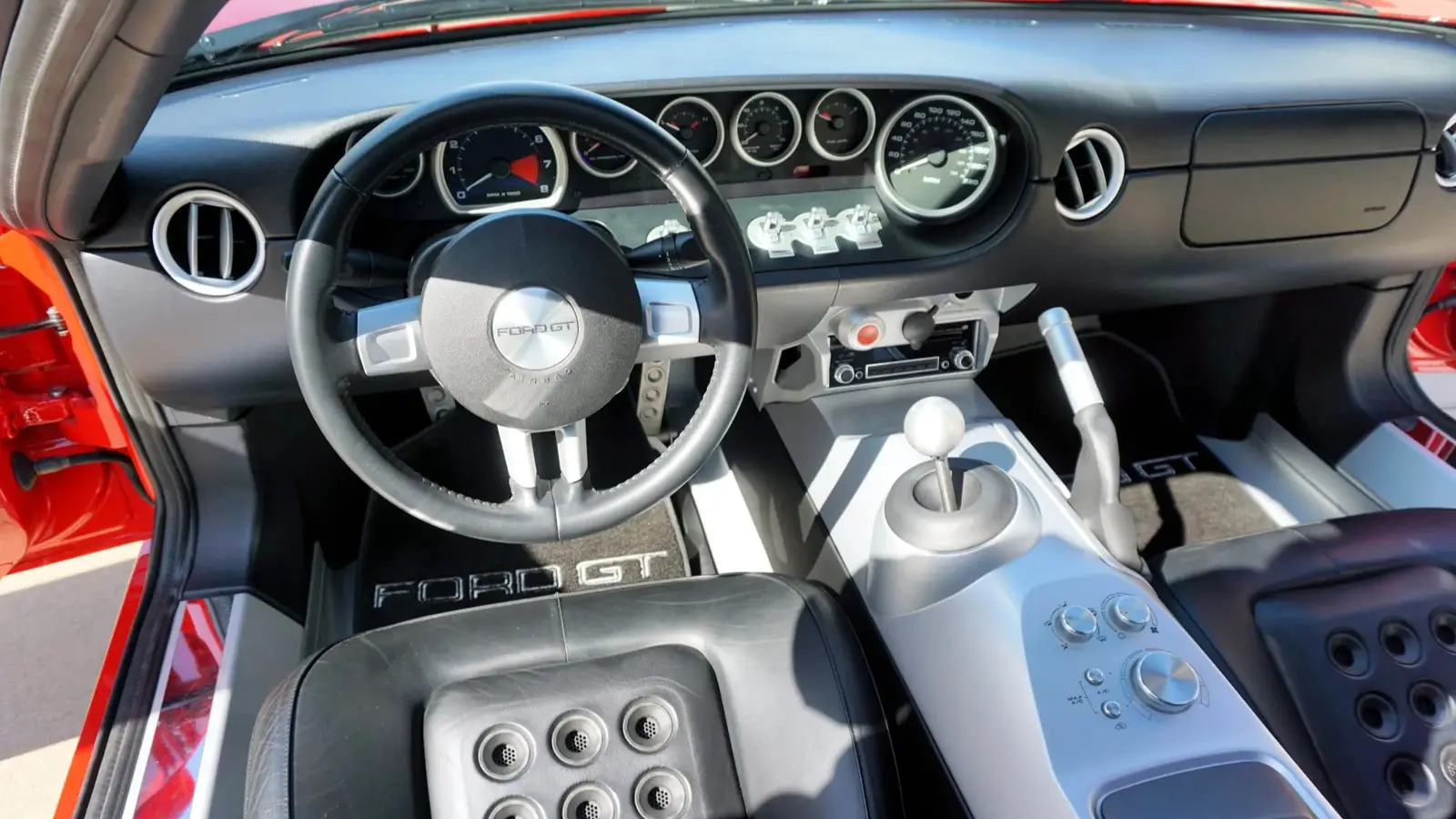 O interior é revestido em couro Ebony, com assentos projetados pela Sparco que utilizam cascos de fibra de carbono. O painel de instrumentos inspira-se no lendário Ford GT40, incluindo um layout distinto com o tacômetro centralizado.
